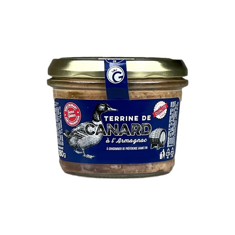 Složení: vepřová krkovice (původ Francie), kachní maso s kůží*, kuřecí játra, libová kachní játra, mléko, vejce, sůl, armagnac 0,8 %, koření, přírodní aroma. (*kachna 28 %) Alergeny: mléko, vejce.