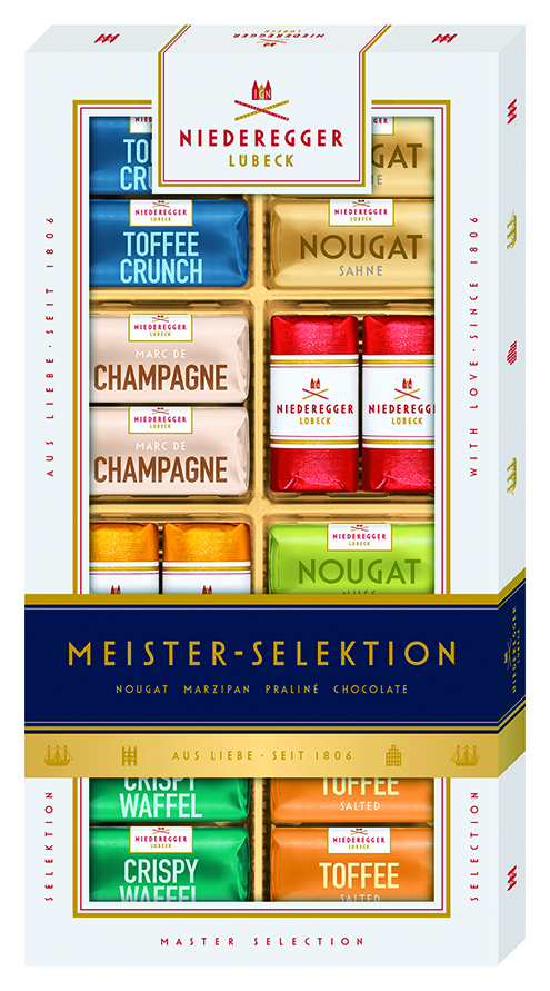 Mléčná čokoláda 34 % (cukr, kakaové máslo, sušené plnotučné MLÉKO, kakaová hmota, emulgátor: lecitin (SÓJA), vanilkový extrakt), cukr, hořká čokoláda 12 % (kakaová hmota, cukr, kakaové máslo, emulgátor: lecitin (SÓJA), vanilkový extrakt), MANDLE 9,3 %, bílá čokoláda (cukr, kakaové máslo, sušené plnotučné MLÉKO, emulgátor: lecitin (SÓJA), vanilkový extrakt), LÍSKOVÉ OŘECHY 5,2 %, kakaové máslo, sušené odstředěné MLÉKO, karamel 2,1 % (glukózo-fruktózový sirup, slazené kondenzované MLÉKO, MÁSLO, cukr, voda, sůl), slunečnicový olej, SMETANA, sušená SMETANA, sušené plnotučné MLÉKO, přírodní aroma, alkohol, kakaová hmota, invertovaný cukrový sirup, pomerančová kůra, částečně odstředěné kondenzované MLÉKO, oplatkový granulát (bramborový škrob, cukr, mouka z cizrny, kukuřičná mouka, kokosový tuk, emulgátor: lecitin, jedlá sůl, přírodní aroma), Marc de Champagne, glukózový sirup, glukózo-fruktózový sirup, pomerančový ovocný prášek (maltodextrin, pomeranče, přírodní pomerančové aroma), MLÉČNÝ cukr, přírodní vanilkové aroma, emulgátor: lecitin (SÓJA), jedlá sůl, MÁSLO v přepuštěné tuky, karamel, karamelový sirup, vanilkový extrakt, zvlhčující látka: invertáza, kyselící látka: kyselina citronová.