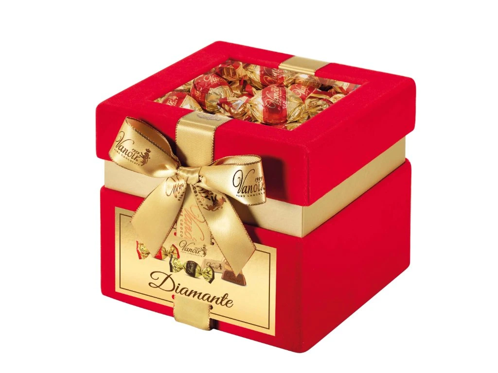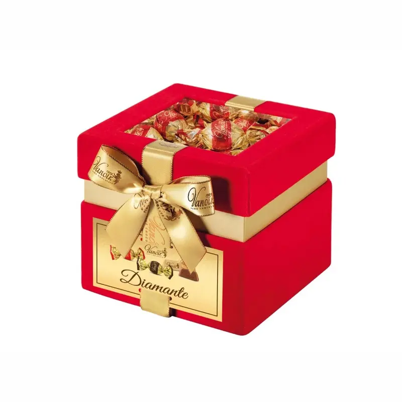 Dárková sametová krabička obsahující tři patra, kdy Vás každé okouzlí jiným druhem čokolády. Ať už to bude gianduiotti, hořké pralinky či lískoořškové. Chybu neuděláte.
